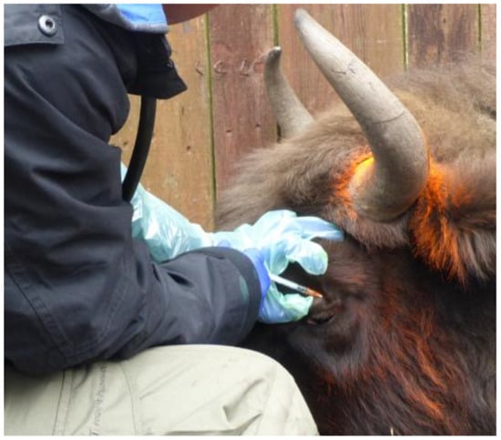 Ante-mortem diagnostics were conducted as part of the health monitoring rules, which do not require the consent of the ethics committee under Polish law []. The animals were subjected to pharmacological immobilization by remote injection using a Palmer Cap-Chur tranquilization gun. The body weight (BW) of the animals was estimated at 400–650 kg, depending on the individual, and the nutritional status from fair to good. Anesthesia was performed with etorphine hydrochloride (Captivon®, 9.8 mg/mL, Wildlife Pharmaceuticals, White River, South Africa) at a dose of 0.005–0.01 mg/1 kg BW and xylazine (Nerfasin®, 100 mg/mL, Livisto, Senden, Germany) at a dose of 0.3–0.4 mg/1 kg BW. To revive the animals, the following agents were administered: diprenorphine hydrochloride (Activon®, 12 mg/mL, Wildlife Pharmaceuticals, White River, South Africa) in a dose corresponding to the amount of etorphine administered, naloxone hydrochloride (Naloxonum Hydrochloricum WZF 400 µg/mL solution for injection, Polfa, Warsaw, Poland) using 1 ampoule (1 mL) for European bison, and atipamezole hydrochloride (Antisedan®, 5 mg/mL, Orion Pharma, Espoo, Finland) at a dose of 0.015–00.2 mg/1 kg BW []. The ante-mortem sample collection procedure lasted from 20 to 40 min. Blood was first collected with a 1.2 mm diameter 4 mm long needle in tubes containing lithium heparin (Medlab Products, Raszyn, Poland) from the external jugular vein, and then TST was conducted.