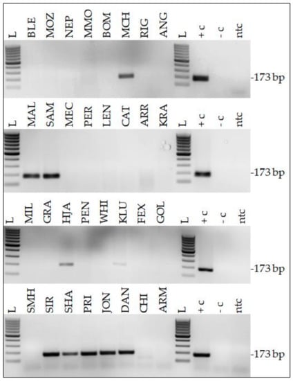 DNA isolated from 49 equine HNSCCs (49 equine patients) was assessed for the presence of EcPV type 2, 3, and 5 DNA on the grounds that these three EcPV2 types are reported to occur in equine SCC [9,10,41,42]. As expected, EcPV2 PCR from 4/15 native lesions previously shown to contain EcPV2 DNA [13] yielded amplicons of anticipated size (173 bp; Table 1; Figure 1). DNA extracted from another native tumor (VLU) also scored positive for this virus type. From the DNA aliquots derived from 27 FFPE tumor samples, six tested positive by EcPV2 PCR (Table 1; Figure 1). None of the tumor DNA samples harbored EcPV3 or EcPV5 DNA (not shown). PCR from positive, negative, and no-template controls included in every reaction yielded anticipated results, thus confirming the experimental accuracy and the validity of results (Figure 1).