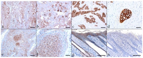 The nerve growth factor receptor known as CD271 (or p75NTR) is a member of the tumor necrosis factor receptor (TNFR) superfamily. In recent years, CD271 has emerged as a promising marker for specific identification of CSC subpopulations in several types of human solid cancers including HN cancers [32,51]. In most tumor sections (17/22), CD271 labeling was mild to moderate, with a diffuse or patchy distribution. Focally intense CD271 labeling was noted in tumor sections derived from two EcPV2-positive (MAL, SIR) horses and one EcPV2-negative (SHM) horse. Centrally accentuated CD271 labeling patterns were noted in two EcPV2-positive cases (PRI, VLU) (Table 3; Figure 7a–f). An equine SCC previously established as a positive control exhibited Ab-binding to the CD271 antigen (Figure 7g), whilst mock labeled sections scored negatively (Figure 7h).