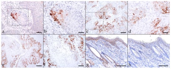 β-catenin labeling of EcPV2-positive and EcPV2-negative HNSCC sections. The figure depicts a representative selection of β-catenin labeling results. (a,b): patchy, strong membranous β-catenin labeling of >50% of tumor cells in an EcPV2-negative oral SCC (KRA). (a) Bar = 150 µm, (b) bar = 80 µm. (c,d): Strong, diffuse β-catenin labeling in an EcPV2-positive, pharyngeal SCC (SAM). (c) Bar = 150 µm, (d) bar = 80 µm. (e,f): Centrally focused β-catenin labeling pattern in an EcPV-positive, maxillary sinusoidal SCC (HJA). (e) Bar = 150 µm, (f) bar = 80 µm. (g,h): Positive and negative control, i.e., β-catenin labeled (g) and mock labeled ((h); no primary Ab) equine skin sections. Bars = 100 µm. Framed areas are presented at higher magnification.