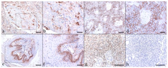 CD44-staining of EcPV2-positive and EcPV2-negative HNSCC sections. The figure depicts a representative selection of CD44-staining results. (a,b): patchy, cytoplasmic, and membranous CD44-staining in an EcPV2-negative, lingual SCC (BOM), (a) bar = 150 µm, (b) bar = 80 µm. (c,d): Patchy, membranous CD44-staining of >50% of tumor cells in an EcPV2-negative oral SCC (MEC), (c) bar = 150 µm, (d) bar = 80 µm. (e,f): Strong marginal CD44-staining pattern in an EcPV2-postive, pharyngeal SCC (SAM), (e) bar = 150 µm, (f) bar = 80 µm. (g,h): CD44- (g, positive control) and mock-staining (h, negative control) of an equine salivary gland section, bar = 100 µm. Framed areas are presented at higher magnification.