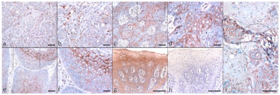 CD271 labeling of EcPV2-positive and EcPV2-negative HNSCC sections. The figure depicts a representative selection of CD271 labeling results. (a,b): Cytoplasmic CD271 labeling of only <10% of tumor cells in an EcPV2-negative, lingual SCC (BOM), (a) bar = 80 µm, (b) bar = 40 µm. (c,d): Mild to moderate, diffuse, membranous CD271 labeling in an EcPV2-positive, oral SCC (VLU). This horse has a history of penile SCC harboring the same genetic EcPV2 variant as the oral tumor, (c) bar = 80 µm, (d) bar = 40 µm. (e,f): Central CD271 labeling is likewise observed in sections of this oral SCC (VLU), (e) bar = 80 µm, (f) bar = 40 µm. (g,h): CD271 positive (g) and negative control (h) (equine SCC ± primary Ab), bar = 100 µm. Framed areas are presented at higher magnification. (i): EMT in a lingual SCC, as revealed by CD271-staining. Transition of tumor cells of typically polygonal epithelial phenotype into spindle-type cells (encircled area) within the infiltration front of an EcPV2-negative, metastasizing lingual SCC (BOM). Bar = 100 µm.