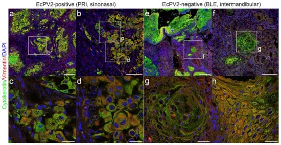 Vimentin staining of EcPV2-positive and EcPV2-negative HNSCC sections. The figure depicts a representative selection of vimentin labeling results. (a,b): Detection of vimentin in an EcPV2-positive maxillary sinusoidal SCC (HJA) in <10% of tumor cells, (a) bar = 80 µm, (b) bar = 40 µm. (c,d): Vimentin staining of <50% of tumor cells in an EcPV2-negative sinusoidal SCC (MMO), (c) bar = 80 µm, (d) bar = 40 µm. (e,f): Detection of vimentin in >50% of tumor cells in an EcPV2-negative maxillary sinusoidal SCC (FIL), (e) bar = 80 µm, (f) bar = 40 µm. (g,h): Vimentin (g) and mock labeling (h) of mesenchymal equine skin cells, bar = 100 µm. Framed areas are presented at higher magnification.