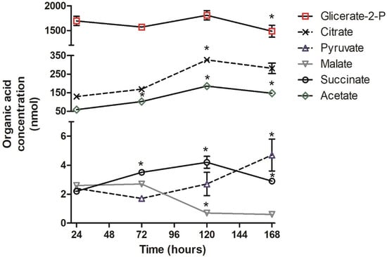 Concentration of the organic acid from parasites in different times of the cultivation in TAU3AAG medium: glycerate 2p (−□−), citrate (−X−), pyruvate (−Δ−), malate (−∇−), acetate (−◊−) and succinate (−O−). The values correspond to the mean ± S.D (three biological replicates) of the concentration in nmoles of organic acid of three experiments determined in a population of 3 × 108 parasites. *: p ≤ 0.05, statistically significant from previous time point.