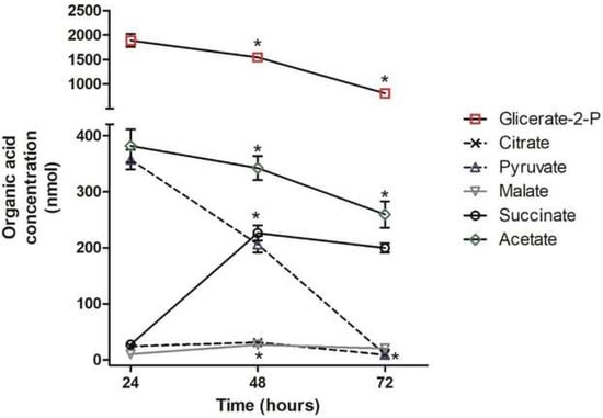 Concentration of parasites’ organic acids after different growth periods as a function of growth time in BHI media. The concentrations of succinate (−O−), malate (−∇−), and pyruvate (−Δ−) were nearly equivalent and appeared superimposed, while citrate (−X−) and acetate (−◊−) show similar profiles during cultivation. However, the glycerate 2p (−□−) concentration was noticeably higher than the others were. Values correspond to the mean ± SD (three biological replicates) of organic acid concentration measured in three independent cultures from a sample size of 3 × 108 parasites. *: p ≤ 0.05, statistically significant from previous time point.