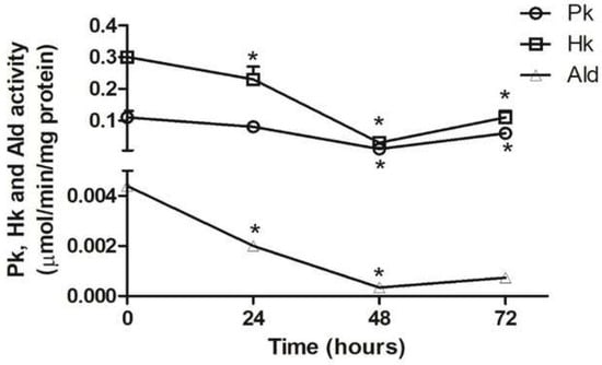 Specific enzymatic activity of pyruvate kinase (Pk), hexokinase (Hk), and aldolase (Ald) in T. cruzi during its differentiation to trypomastigotes in TAU3AAG medium. The percentage of trypomastigotes forms were < 1%, 25%, 50%, and 70% at 0, 24, 48, and 72 h, respectively. *: p ≤ 0.05, statistically significant from previous time point.