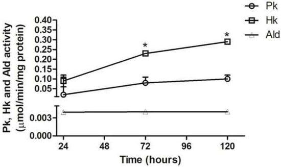 Activity of pyruvate kinase (Pk), hexokinase (Hk), and aldolase (Ald) in T. cruzi cultured in BHI medium for different times. Extracts from 2 × 108 parasites were assayed in three independent experiments, and the values plotted correspond to the average. The unit for Pk and Hk was µmoles subst/min/mg protein, and for the aldolase nmoles subst/min/mg protein and means an S.D. are presented. *: p ≤ 0.05, statistically significant from previous time point.