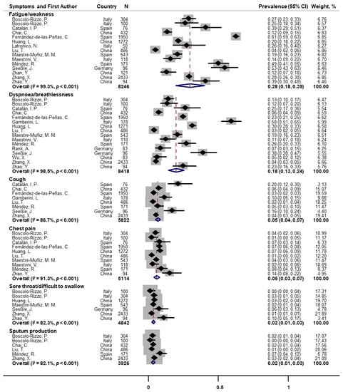 Random-effects meta-analyses were conducted for 27 individual symptoms separately. Fifteen and sixteen papers assessed fatigue/weakness and dyspnoea/breathlessness at one-year follow-up, the pooled prevalence of which were 28% (95% CI: 18–39) and 18% (95% CI: 13–24), respectively (Figure 2). Substantial heterogeneity across studies was observed (I2 = 99.3% and 98.5%, both p < 0.001). Other post-COVID respiratory symptoms were also reported but with much lower prevalence. The pooled prevalence was 5% for cough (n = 8; 95% CI: 4–7; I2 = 86.7%), 5% for chest pain (n = 10; 95% CI: 3–7; I2 = 91.3%), 2% for sore throat/difficulty swallowing (n = 7; 95% CI: 1–3; I2 = 82.3%), and 2% for sputum production (n = 6; 95% CI: 1–3; I2 = 82.1%; Figure 2).
