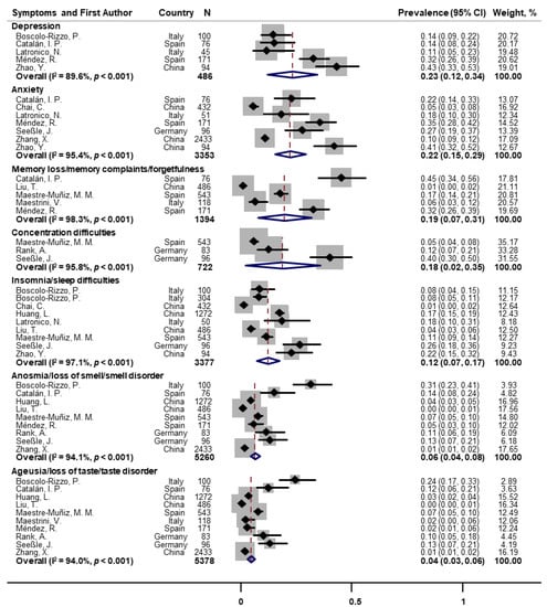 Mental health and cognitive symptoms were frequently reported among COVID-19 survivors (Figure 3). The pooled prevalence for depression and anxiety symptoms were 23% (n = 5; 95% CI: 12–34; I2 = 89.6%) and 22% (n = 7; 95% CI: 15–29; I2 = 95.4%), respectively. Memory loss/memory complaints/forgetfulness and concentration difficulties were also commonly experienced, with the pooled prevalence of 19% (n = 5; 95% CI: 7–31; I2 = 98.3%) and 18% (n = 3; 95% CI: 2–35; I2 = 95.8%), respectively. Insomnia/sleep difficulties had a pooled prevalence of 12% (n = 9; 95% CI: 7–17; I2 = 97.1%). In addition, the pooled prevalence of anosmia/loss of smell/smell disorder and ageusia/loss of taste/taste disorder were 6% (n = 9; 95% CI: 4–8; I2 = 94.1%) and 4% (n = 10; 95% CI: 3–6; I2 = 94.0%), respectively.