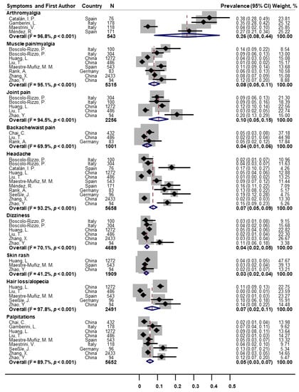 As for other classes of symptoms (Figure 4), the pooled prevalence was 26% for arthromyalgia (n = 4; 95% CI: 8–44; I2 = 96.8%), 8% for muscle pain/myalgia (n = 8; 95% CI: 5–11; I2 = 95.1%), 10% for joint pain (n = 5; 95% CI: 5–15; I2 = 94.5%), 4% for backache/waist pain (n = 3; 95% CI: 1–6; I2 = 69.9%), 7% for headache (n = 11; 95% CI: 5–9; I2 = 93.2%), 4% for dizziness (n = 6; 95% CI: 2–5; I2 = 70.1%), 3% for skin rash (n = 3; 95% CI: 2–4; I2 = 41.2%), 7% for hair loss/alopecia (n = 5; 95% CI: 2–11; I2 = 97.8%), and 5% for palpitations (n = 9; 95% CI: 3–7; I2 = 89.7%).