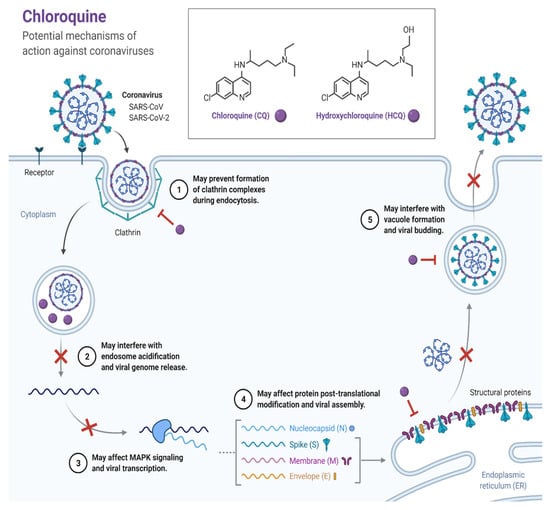 The mechanisms of action of chloroquine against coronaviruses. (Created with BioRender.com, accessed on 10 January 2022).