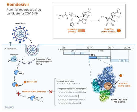 The mechanisms of action of Remdesivir against coronaviruses. (Created with BioRender.com, accessed on 10 January 2022).