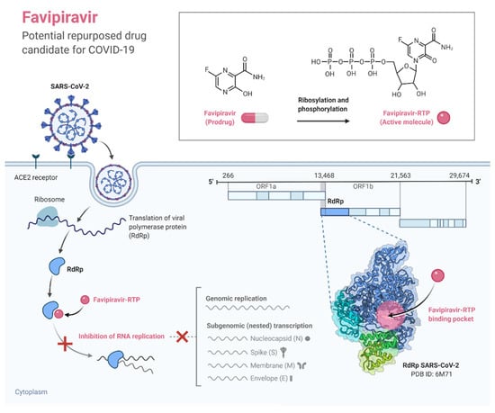 The mechanisms of action of Favipiravir against coronaviruses. (Created with BioRender.com, accessed on 10 January 2022).