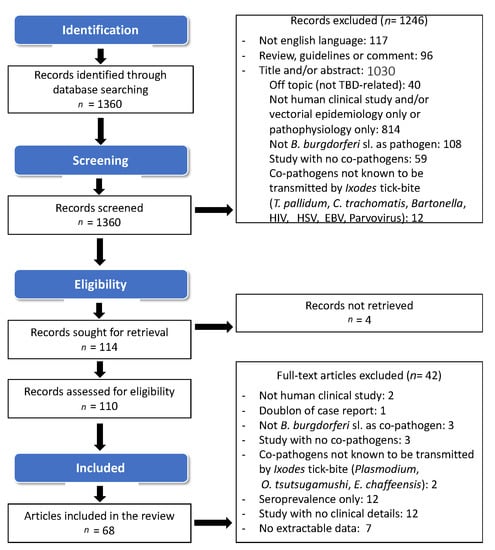 The following inclusion criteria had to be met: (i) articles written in English; (ii) original studies or case reports; (iii) human clinical study about tick-borne diseases; (iv) study including at least one or more case of human infection by exposure to B. burgdorferi s.l. and one other TBM potentially transmitted by Ixodes ticks and (v) at least one of the TBMs.