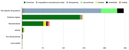 Clinical picture of EM including six multiple EM (273/655 cases), followed by neuroborreliosis (93/655 cases) and Lyme arthritis (7/655 cases), were then reported. After article reviewing, the diagnosis met the criteria of a confirmed infection for 94.6% of the EM cases, 77.4% of the neuroborreliosis cases, and for 57.1% of the Lyme arthritis cases. Figure 2 shows detailed clinical pictures and their level of imputability.