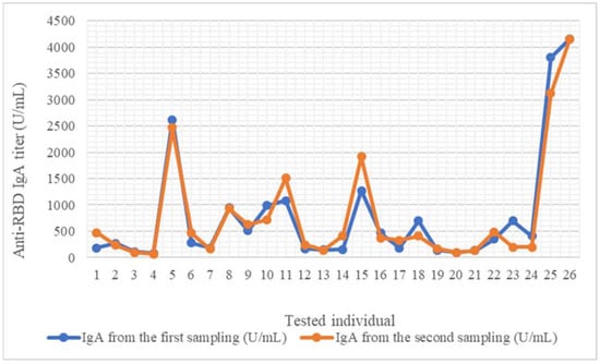 Anti-RBD IgA antibodies were present in all 52 breast milk samples, both in the first and in the second specimens. The antibody titers varied between 84.872 U/mL and 4161.707 U/mL, and between 64.435 U/mL and 4159.966 U/mL for the first and second sample, respectively. Fifteen (57.7%) mothers had a higher IgA titer in the first specimen than the second one, two (7.7%) elicited approximately the same results in both samples, and for nine of them (34.6%), the IgA titer was higher in the second sample (Figure 1). The average for the first sampling was 774.96 U/mL, and for the second one, the average was 774.1 U/mL.