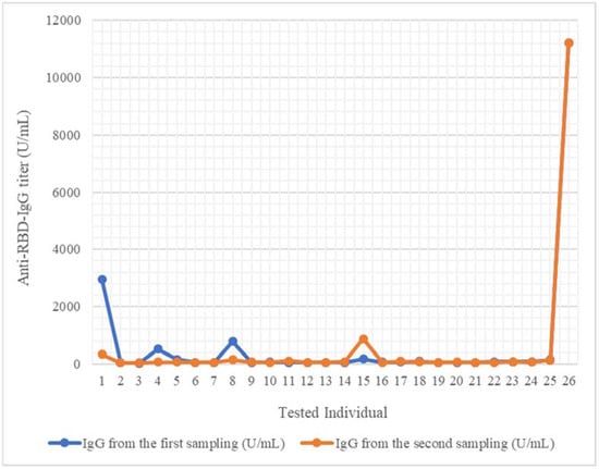 All mothers excreted anti-RBD IgG in breast milk. The titers ranged between 22.962 U/mL and 11,206.348 U/mL for the first specimen, and between 39.435 U/mL and 11,221.62 U/mL for the second one (Figure 2). For 14 (53.8%) of the first samples, the measured concentrations were higher compared to the second one; in 4 (15.4%), the titers were approximately equal in the second sample, and for 8 samples (30.8%), the values were higher in the second specimen. The average for the first sampling was 658.81 U/mL, and for the second one, the average was 540.58 U/mL.