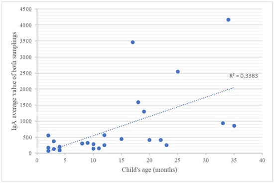 The results of all the immunoglobulin values were positively correlated with the child’s age (for the correlation with the first IgA sample, p = 0.002, for the second IgA sample, p = 0.000, for the first IgG sample, p = 0.046, and for the second IgG sample, p = 0.013), with a strong correlation between the anti-RBD IgA titers and the child’s age (r = 0.57 for the first sample and r = 0.68 for the second sample), while only a medium correlation (r = 0.34 for the first sampling and r = 0.32 for the second sampling) emerged between the child’s age and the anti-RBD IgG values. Taking into account the fact that the value of the correlation coefficient is positive, we can conclude that the values of anti-RBD IgA and IgG were directly proportional to the age of the child. This actually shows that the immune response expression in the breast milk directly depends on the period of breastfeeding: the longer the breastfeeding period, the higher the amount of milk immunoglobulins. These findings are supported by the results of Czosnykowska-Łukacka et al. [31], who showed that, during the first year of lactation, the concentrations of anti-RBD IgA and IgG were lower than in the second year, or the results of Ramirez et al. [15], showing as well that the antibody concentrations in the milk of mothers who were breastfeeding for 24 months were significantly higher than mothers who were breastfeeding for less than 24 months. Thus, in view of the high concentration of immunologically important compounds present in human milk, prolonged lactation should be strongly supported [31].