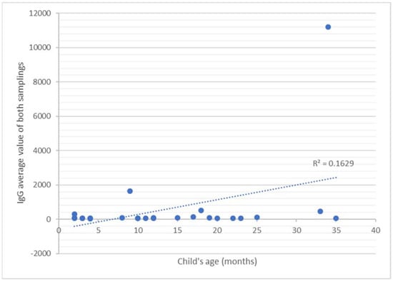 For the other variables, we used the Spearman test; therefore, we correlated the results of the second anti-RBD IgA sample and the results of anti-RBD IgG from both samples with the baby’s and mother’s ages, with the baby’s rank, and with the mother’s pathological history. The correlations of both IgA and IgG values with the child’s age were positive (p < 0.05) (Table 2): a strong relationship (r = 0.68) emerged between the anti-RBD IgA values and the child’s age (Figure 3), while a medium correlation between the anti-RBD IgG values and the child’s age could be noticed (r = 0.34 for the first collection and r = 0.32 for the second sampling) (Figure 4). The other parameters, such as the rank of the babies’ and the mothers’ ages, did not correlate with the amount of antibodies excreted in the breast milk. All results are presented in Table 2.