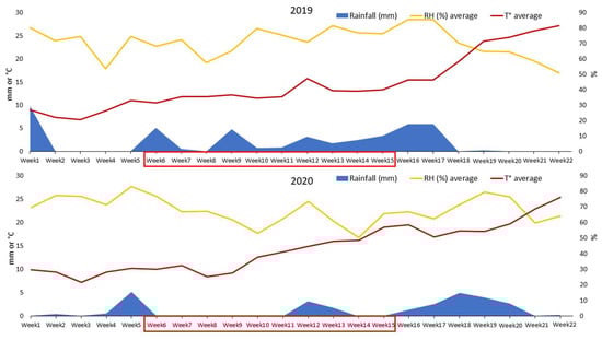 Weather data [rainfall (mm), relative humidity (%), and temperature (°C)] recorded at the Experimental Station “FIELDLAB” (Perugia, central Italy) where the field experiment was carried out in the two experimental years (2019 and 2020). For each experimental year, 18 weeks (from 1 February, BBCH 23 to 4 July, BBCH 99) were considered, and the average weekly data of rainfall (mm), relative humidity (%) and temperature are shown. The red square indicates the time frame (8 March, BBCH 30 to 16 May, BBCH 70) during which barley foliar diseases usually occur in central Italy.