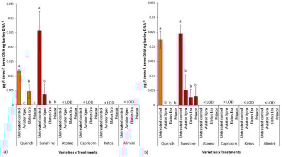 Average (three replicates) of P. teres f. teres biomass accumulation (pg DNA ng barley DNA−1) quantified by qPCR during 2019 (a) and 2020 (b) in the grains of the six barley cultivars tested. Each cultivar received three different fungicide applications and had one untreated control. Within each cultivar, letters (a-b) above the columns indicate the presence of statistically significant differences (p ≤ 0.05) according to Duncan’s multiple comparison tests. LOD is the limit of detection.