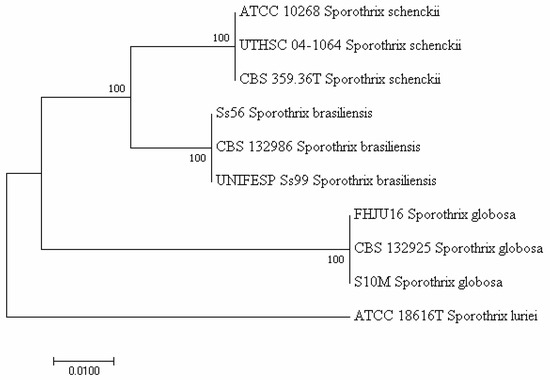 - Marimon, R.; Gené, J.; Cano, J.; Trilles, L.; Dos Santos Lazéra, M.; Guarro, J. Molecular phylogeny of Sporothrix schenckii. J. Clin. Microbiol. 2006, 44, 3251–3256. [Google Scholar] [CrossRef] [PubMed] [Green Version]