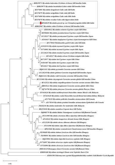 Phylogenetic tree constructed by maximum likelihood displaying M. grassi sp. nov. (KP268649) from C. idella clustering next to the Indian group of myxosporean. GenBank accession numbers are given before the species and numbers on the nodes represents the bootstrap confidence values.