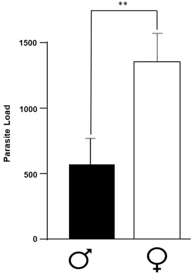 Parasite load in infected mice of both sexes. Data show the average of the number of parasites recovered from the peritoneal cavity of 10 female (white bar) and 10 male (black bar) BALB/c mice at 16 weeks post-infection. Each bar represents the average +/− SD in every sex at 16 weeks post-infection. **, p < 0.001 when comparing male and female infected mice.