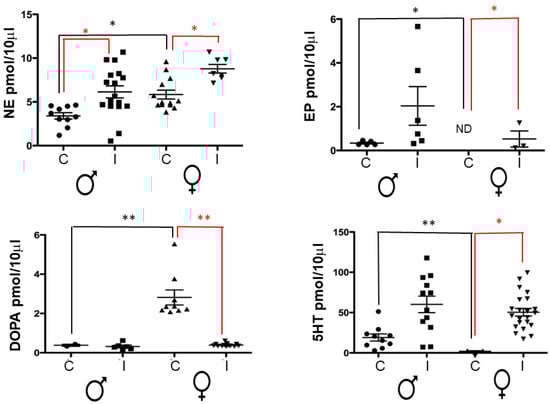 Splenic levels of neurotransmitters in the control groups and in female and male mice infected with T. crassiceps. The levels of NE, EP, DOPA, and 5HT were measured in the spleen of the different experimental groups. Data show the levels of neurotransmitters corresponding to 20 female (10 controls and 10 infected) and 20 male (10 controls and 10 infected) BALB/c mice at 16 weeks post-infection The black lines show differences between gender, the red lines show differences between control and infected animals. p < 0.05 *, p < 0.01 **. Abbreviations: ND, Not Detected, NE, norepinephrine; EP, epinephrine; DOPA, dopamine; 5-HT, serotonin; C, uninfected control; I, infected. Significance in black indicates difference between the control groups of both sexes. Significance in red color indicates difference between the control group and the infected group of the same sex.