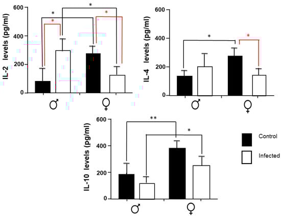 Levels of splenic IL-2, IL-4, and IL-10 in the control groups and in male and female mice infected with T. crassiseps. Data show the levels of different cytokines corresponding to 20 female (10 controls and 10 infected) and 20 male (10 controls and 10 infected) BALB/c mice at 16 weeks. The black lines show differences between gender; the red lines show differences between control and infected animals. p < 0.05 *, p < 0.01 **. Significance in black indicates difference between the control groups of both sexes. Significance in red color indicates difference between the control group and the infected group of the same sex.