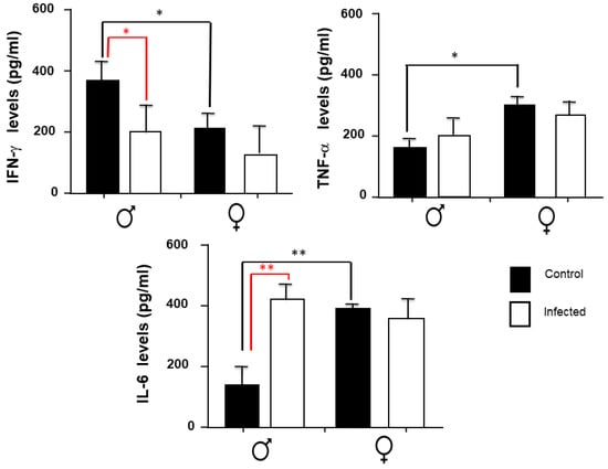 Levels of splenic IFNγ, TNF-α, and IL-6 in the control groups and in male and female mice infected with T. crassiseps. Data show the levels of different cytokines corresponding to 20 female (10 controls and 10 infected) and 20 male (10 controls and 10 infected) BALB/c mice at 16 weeks. The black lines show differences between gender; the red lines show differences between control and infected animals. p < 0.05 *, p < 0.01 **. Significance in black indicates difference between the control groups of both sexes. Significance in red color indicates difference between the control group and the infected group of the same sex.