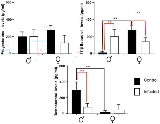 Splenic levels of steroid hormones, progesterone, estradiol, and testosterone, in the control groups and in male and female mice infected with T. crassiseps. Data show the levels of different hormones corresponding to 20 female (10 controls and 10 infected) and 20 male (10 controls and 10 infected) BALB/c mice at 16 weeks post-infection, p < 0.001 ** when comparing the control group and infected individuals. The black lines show differences between gender, the red lines show differences between control and infected animals. p < 0.01 **. Significance in black indicates difference between the control groups of both sexes. Significance in red color indicates difference between the control group and the infected group of the same sex.