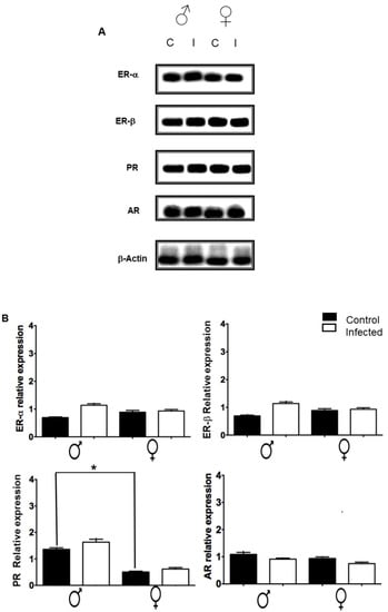 Splenic levels of the different steroid receptors, ERα, ERβ, PR, and AR, evaluated in male and female mice non-infected and infected with T. crassiseps. A representative image (A) and the densitometry analysis of the different experiments (B) are shown. β-actin was used as the loading control. Normalization of values was carried out against the loading control. 20 female (10 controls and 10 infected) and 20 male (10 controls and 10 infected) BALB/c mice at 16 weeks were used. The black lines show differences between gender. p < 0.05 *.