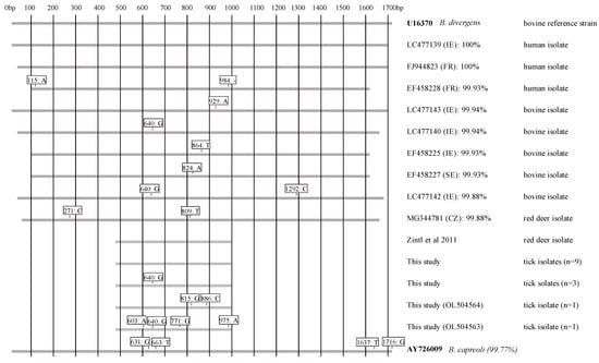 Babesia divergens 18S rRNA gene sequences isolated from ticks during the present study compared to corresponding sequences from B. divergens isolates from humans, cattle and red deer reported from Ireland and several other European countries (as indicated by country abbreviations in the legend). U16370 and AY726009 are treated as reference sequences for B. divergens and Babesia capreoli respectively. All numbers refer to positions in U16370. Identity scores also refer to U16370 and were derived using Clustal Omega. SNPs in positions 631, 663 and 1637 are considered characteristic for B. capreoli []. ‘-’ indicates a missing base.