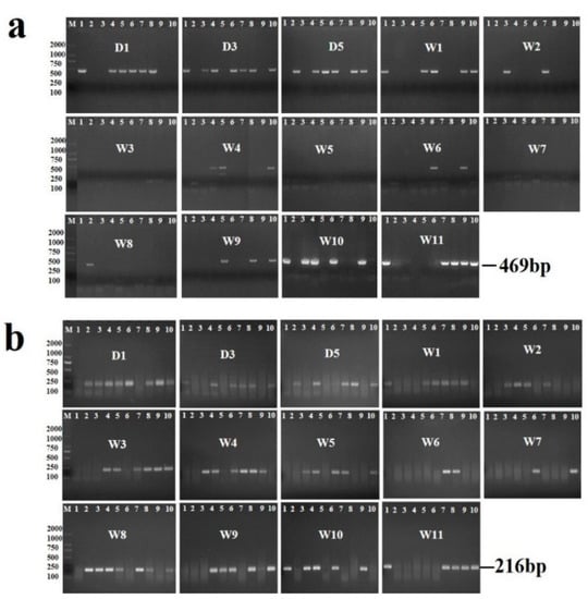 The results of the PCR assay (a) and RPA assay (b) for detecting S. japonicum in snails at different time points post-infection. The snail DNA was from 14 time points post-infection; ten snail DNA samples were tested at each time point, and each lane showed the result of one DNA sample of a snail. M represented the DNA size marker. D1, D3, D5, W1, W2, W3, W4, W5, W6, W7, W8, W9, W10 and W11 represented the time point of snail collection post-infection. Note: D is the abbreviation of Day, W is the abbreviation of Week. The amplicon size by PCR is 469 bp, while this is 216 bp by the RPA assay.