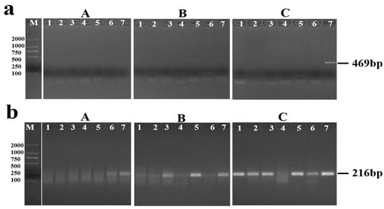Examination of serum DNA by PCR assay (a) and RPA assay (b). A: group A (5 cercariae), B: group B (10 cercariae), C: group C (20 cercariae). For (a,b), lane 1–7 represented the results of the third day, first week, second week, third week, fourth week, fifth week and sixth week post-infection, respectively.