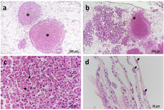 Histopathology of blue mussels Mytilus edulis. (a) Large granulocytomas (*) located within the vesicular connective tissue (VCT). Haematoxylin and eosin (H&E) stain. (b) Large granulocytoma associated with haemocytic infiltration at the periphery of the lesion (*). H&E stain. (c) Detail of eosinophilic granulocytes (arrows) within the lesion. H&E stain. (d) Inclusions containing basophilic prokaryotic organisms (arrows) in the epithelium of gill lamellae (arrows). H&E stain.