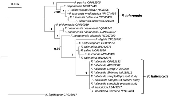 An alignment of 16S rRNA gene sequences (1454 nucleotides) was carried out with MAFFT (https://www.ebi.ac.uk/Tools/msa/mafft/, accessed on 7 January 2022) using sequences available in GenBank from F. persica (CP012505), F. hispaniensis (NC017449), F. tularensis (AY928396, NR074666, CP000437, Z21931), F. philomiragia (CP010019), F. noatunensis (DQ309246, PRJNA73457, NC017909), F. uliginis (CP016796), F. endociliophora (CP009574), F. salimarina (MN242376, MN240487, MN242375), F. salina (NC015696) and F. halioticida (CP022132, AP023082, JF290369, NR118116, AB449247, NR112804) and the ones obtained in the present study. The Bayesian analysis was conducted using the MrBayes-3.2.7 software [32]. The GTR substitution model was used with gamma-distributed rate variation across sites and a proportion of invariable sites (GTR + I + G). An initial Markov chain Monte Carlo run with 20,000 generations was performed followed by a second run with 100,000 generations that resulted in a standard deviation of split frequencies below 0.01. The interactive tree of life (iTOL) webserver (https://itol.embl.de, accessed on 7 January 2022; [33]) was used to display the phylogenetic tree.