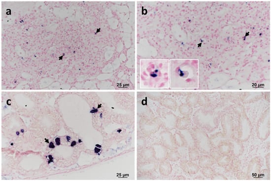 In situ hybridisation (ISH) of the 16S rRNA gene of Francisella halioticida infecting blue mussels collected in 2013. The labelling is observed microscopically as dark blue staining. (a,b) Haemocytic infiltration within the vesicular connective tissue (VCT). (b) Insets show the detail of positively labelled granulocytes (arrows). (c) Positive labelling of intracellular prokaryotic inclusion bodies (arrows) within digestive cells of the digestive tubule epithelium. Note the absence of any associated inflammatory response. (d) Negative control using a non-specific probe.
