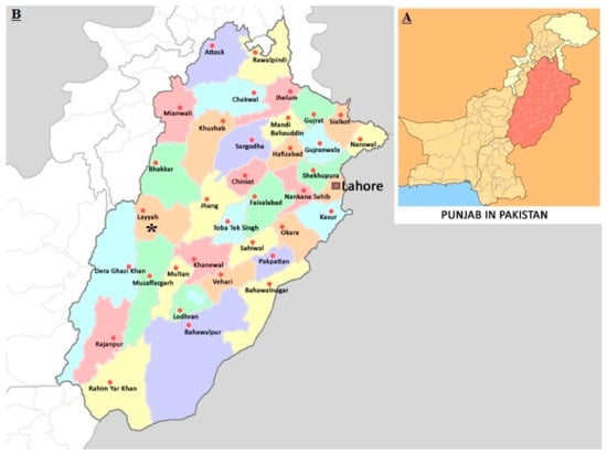 (A) Map of Pakistan with highlighted Punjab province. (B) District Layyah, where cattle blood samples were collected from, is marked with * in magnified section.