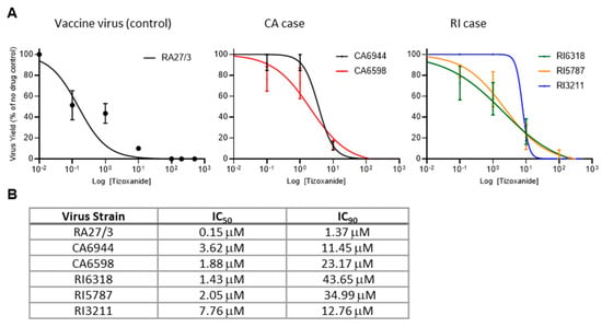 Inhibition of replication of iVDRV strains isolated from skin lesions before and after the NTZ therapies. (A). Dose response analysis of A549 cells treated with tizoxanide and infected with iVDRV strains. Data represent the mean of three (RA27/3, CA strains) or four (RI strains) independent experiments +/− SD. (B). Table of IC50 and IC90 of tizoxanide in A459 cells infected with iVDRV strains.