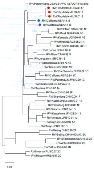 Whole genome sequences were obtained from passage 4 viral stocks of CA6598, RI5787, and RI3211, recovered from lesions after NTZ treatments. Phylogenetic analysis of the genome sequences of CA6944, CA6598, RI5787, RI6318, and RI3211, with full genomes of the WHO RuV reference viruses, showed that all patients’ isolates were RA27/3-derived (Figure 3).