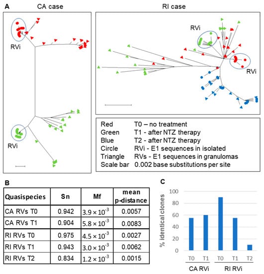 iVDRV quasispecies in tissues and viral isolates before and after NTZ therapy. (A). Neighbor-joining tree (non-rooted) for quasispecies within the granuloma samples (triangles) and virus isolates (circles) from the CA and RI cases. The genetic distances were computed using the Maximum Composite Likelihood method and phylogenetic trees were constructed using Mega10 software. (B). Diversity parameters of quasispecies in skin lesions. (C). Quasispecies diversity in virus isolates.