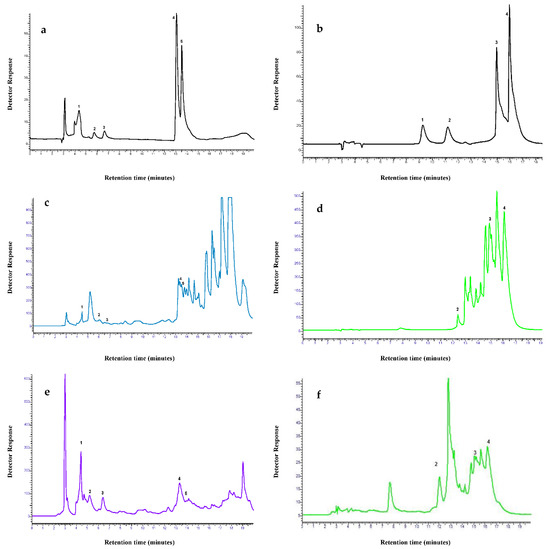 (a) Typical chromatogram of polyphenol standards (100 ppm) at 285 nm. 1 = Gallic acid, 2 = Catechin, 3 = Epicatechin, 4 = Coumaric acid, 5 = trans-Ferulic acid. (b) Typical chromatogram of flavanoids (100 ppm) at 370 nm. 1 = Rutin, 2 = Myrecitin, 3 = Quercetin, 4 = Kaempferol (c) Chromatogram obtained for ethyl acetate fraction at 285 nm. 1 = Gallic acid, 2 = Catechin, 3 = Epicatechin, 4 = Coumaric acid, 5 = trans-Ferulic acid, (d) Chromatogram obtained for ethyl acetate fraction of at 370 nm. 2 = Myrecitin, 3 = Quercitin, 4 = Kaempferol, (e) Chromatogram obtained for n-butanol fraction at 285 nm. 1 = Gallic acid, 2 = Catechin, 3 = Epicatechin, 4 = Coumaric acid, 5 = trans-Ferulic acid, (f) Chromatogram obtained for n-butanol fraction at 370 nm. 2 = Myrecitin, 3 = Quercitin, 4 = Kaempferol.