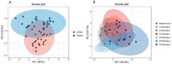 Principal component analysis (PCA) score plots of protein concentrations from pathogen inactivated (PI-PAS) and control (C-PAS) PCs. Measurements were made on Day 1 (baseline, before treatment) and Days 2, 4, and 7 (during storage). (A) PCA score plot for Days 2 to 7 for treatment vs. control. Each dot represents collected data for all 36 proteins. Number of dots on plot represents 3 sampling points × 8 biological replicates = 24 dots for each group (B) PCA score plot for treatment and sampling day. Each different color dot represents a specific sampling for PI treatment or control. Number of dots represent biological replicates = 8.