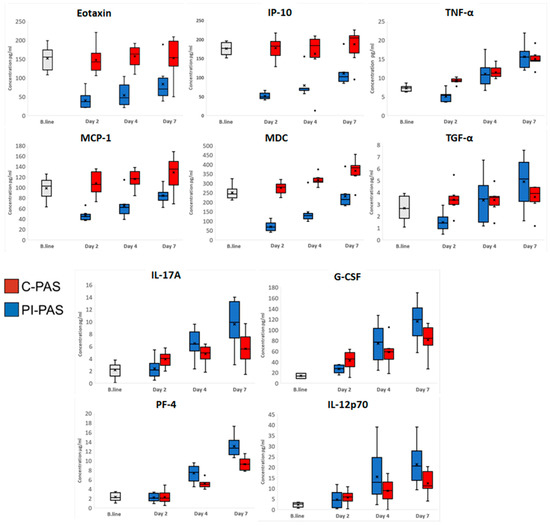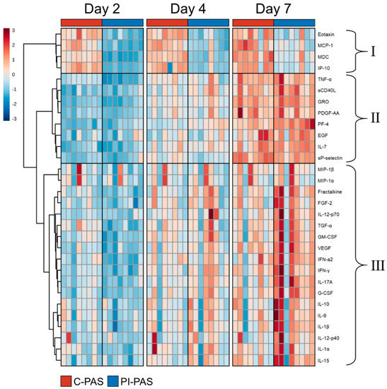 Undiluted platelet supernatant was analyzed using Luminex xMAP Technology (EMD Millipore Corporation, Billerica, MA, USA) to quantify soluble proteins (growth factors, chemokines and cytokines). The Human Cytokine/Chemokine Magnetic Bead Panel (HCYTOMAG-60K, Millipore) was used; it applies microspheres and fluorescent signaling to quantify 41 pre-selected proteins: EGF, eotaxin, FGF-2, FLT-3L, fractalkine, G-CSF, GM-CSF, IFN-α2, IFNγ, IL-1α, IL-1β, IL-1ra, IL-2, IL-3, IL-4, IL-5, IL-6, IL-7, IL-8, IL-9, IL-10, IL-12P40, IL-12P70, IL-13, IL-15, IL-17A, IL-1RA, IP-10, MCP-1, MCP-3, MDC, MIP-1α, MIP-1β, PDGF-AA, PDGF-AB/BB, RANTES, TGF-α, GRO TNFα, TNFβ, CD40L, and VEGF. Not all 41 proteins were included in the data analysis. RANTES and PDGF AA/BB had very high concentrations and were out of range of the assay, while FLT-3L, IL-2, IL-3, IL-4, and IL-6 were all below the detection limit of the assay. Therefore, the concentrations of 34 proteins were included in the analysis for comparing C-PAS and PI-PAS. Concentration differences were compared on Days 2, 4, and 7. The levels of each protein in the control and treatment groups on Days 2, 4, and 7 were also compared to those in a common baseline Day 1 sample.
