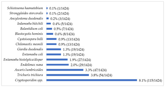 The protozoan Cryptosporidium spp. was the most common parasite (8.1%; 115/1424) observed, followed by the helminth T. trichiura (3.8%; 54/1424) (Figure 1). Up to 39 combinations of multiple parasitic infections were recorded, ranging from two to four parasites (Figure 2). The most common parasitic combination was between the helminths A. lumbricoides and T. trichiura (26.8%; 19/71).