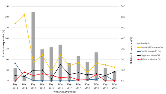 2.5. Evaluation of the Distribution of Intestinal Parasites during the Wet and Dry Periods
