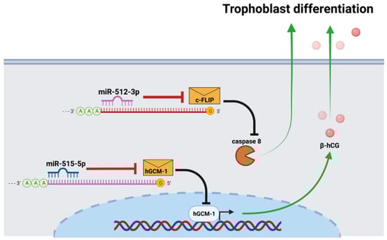 MiR-512-3p- and miR-515-5p = mediated trophoblast differentiation. MiR-512-3p promotes trophoblast differentiation by repressing the caspase 8 inhibitor c-FLIP and, consequently, increases caspase 8 expression, promoting cellular fusion in the trophoblast. Conversely, miR-515-5p inhibits trophoblast differentiation by repressing the transcription factor hGCM-1, which mediates hCG expression.