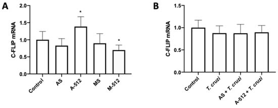 T. cruzi does not affect c-FLIP expression. HPE was transfected with 100 nM of miR-512-3p (A,B) antagomirs (A-512), mimics (M-512), and their respective scrambles (AS or MS) for 24 h and then challenged with 105 T. cruzi trypomastigotes for 2 h. The c-FLIP mRNA expression was determined by means of real-time PCR. All values are given as the means ± SD; data were normalized to control values and analyzed via one-way ANOVA and Dunnett’s post-test. * p ≤ 0.05.